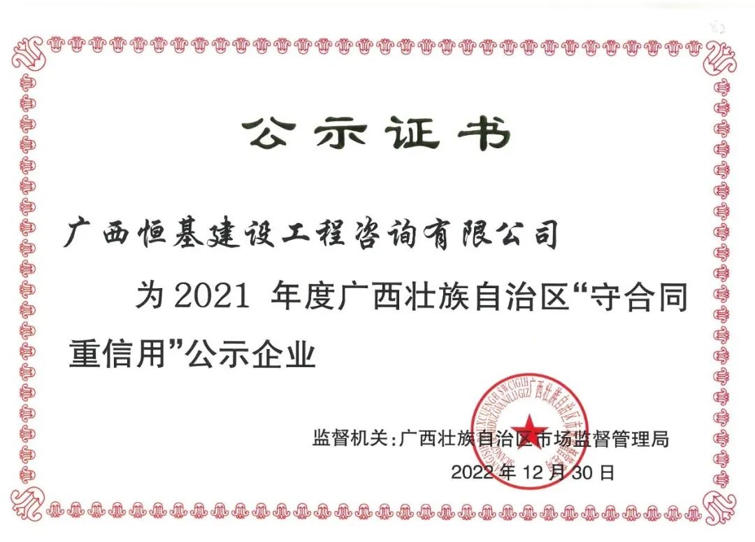 近日,廣西壯族自治區(qū)市場(chǎng)監(jiān)督管理局發(fā)布了《關(guān)于公示廣西2021年度“守合同 重信用”企業(yè)名單的通告》。恒基咨詢憑借良好的市場(chǎng)信譽(yù)和優(yōu)質(zhì)的合同履約能力,榮獲2021年度廣西“守合同重信用”企業(yè)稱號(hào)。