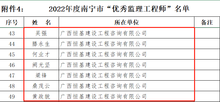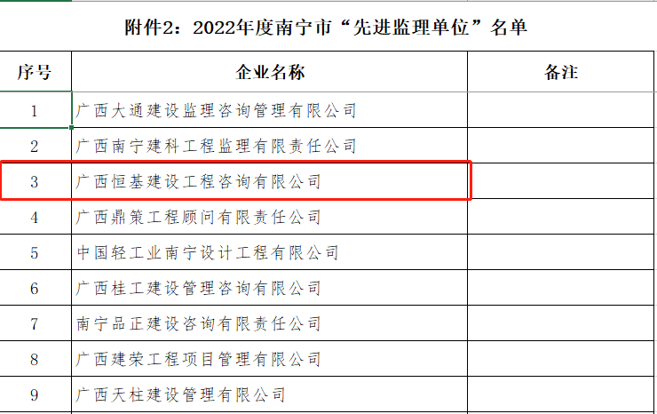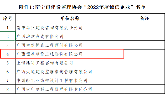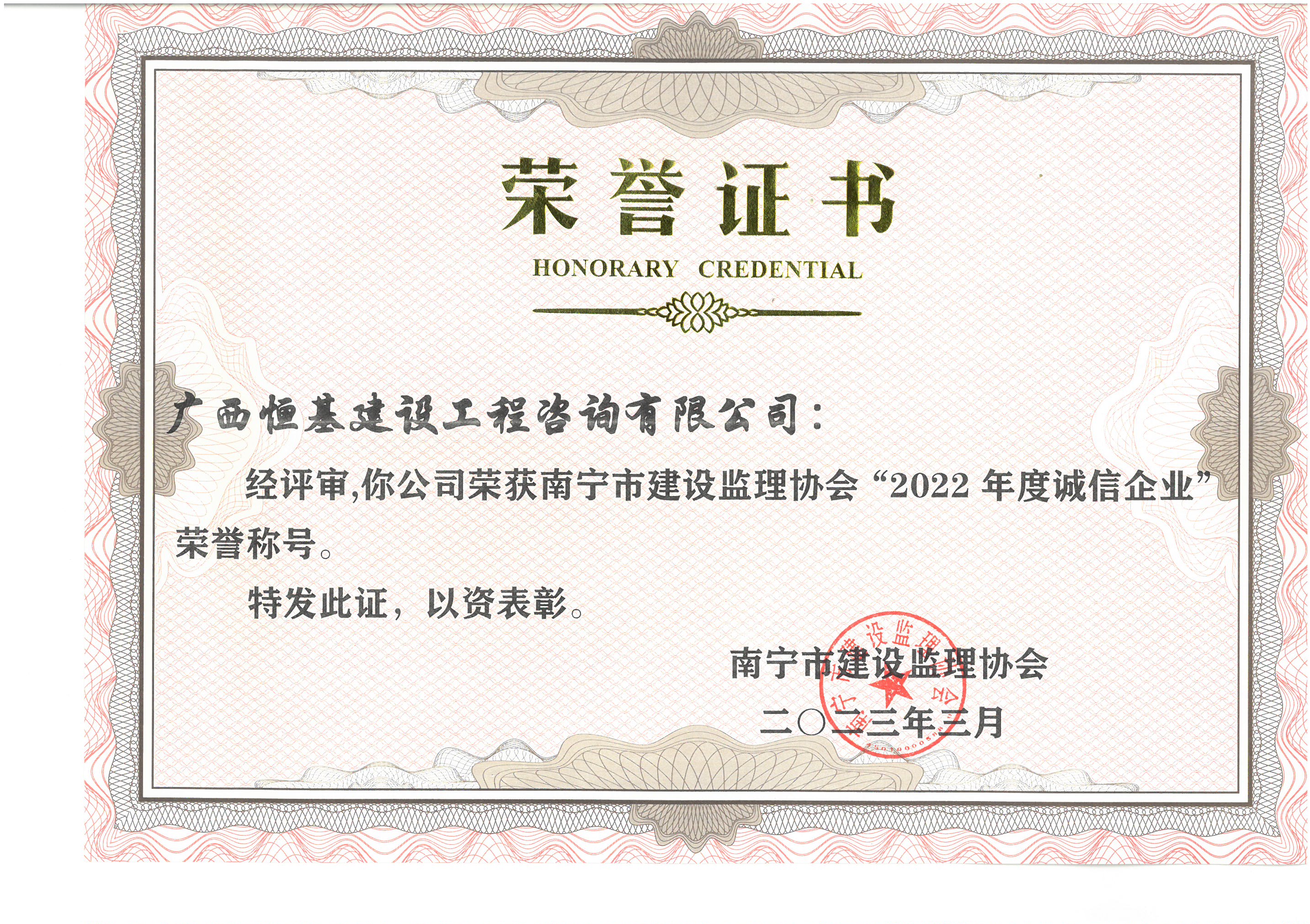 近日,南寧市建設(shè)監(jiān)理協(xié)會(huì)公布了2022年度優(yōu)秀監(jiān)理單位及優(yōu)秀個(gè)人表彰名單,我司連續(xù)多年獲評(píng) “2022年度誠(chéng)信企業(yè)”及2022年度南寧市“先進(jìn)監(jiān)理單位”榮譽(yù)稱(chēng)號(hào)。