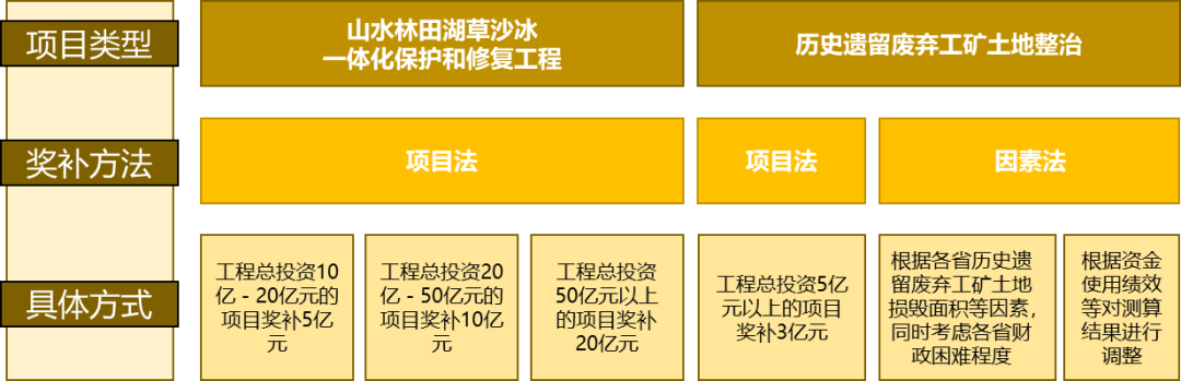 (二)財(cái)資環(huán)〔2021〕100號(hào)《重點(diǎn)生態(tài)保護(hù)修復(fù)治理資金管理辦法》中提出治理資金采取項(xiàng)目法和因素法相結(jié)合的方式分配: