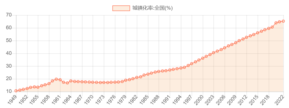 當(dāng)然是我們的城鎮(zhèn)化,我們的城鎮(zhèn)化指數(shù),從1998年的33.35%增長到的2022年65.22%,翻倍了。