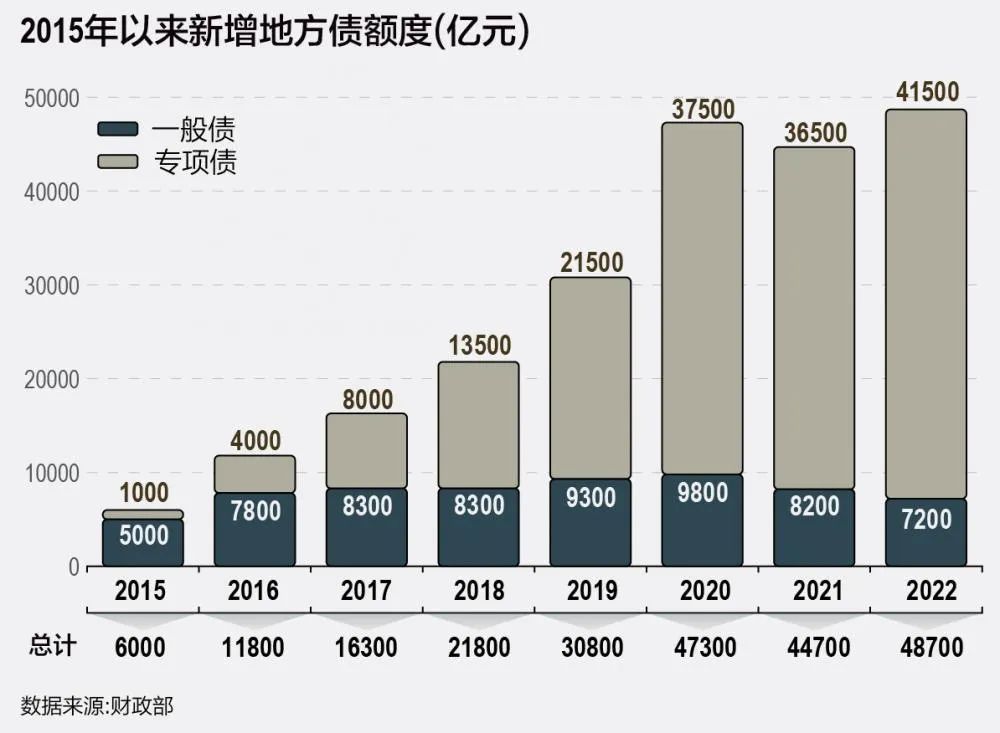 從2014年-2022年歷經(jīng)三任財長,地方債的顯性化取得長足進展:一方面通過發(fā)行置換債券將非地方政府債券形式的債務進行置換,另一方面通過發(fā)行新增債券尤其是新增專項債滿足地方政府的建設資金需求。