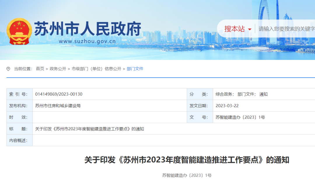 近日,蘇州市住建局印發(fā)《蘇州市2023年度智能建造推進(jìn)工作要點》(蘇智能建造辦〔2023〕1號)。
