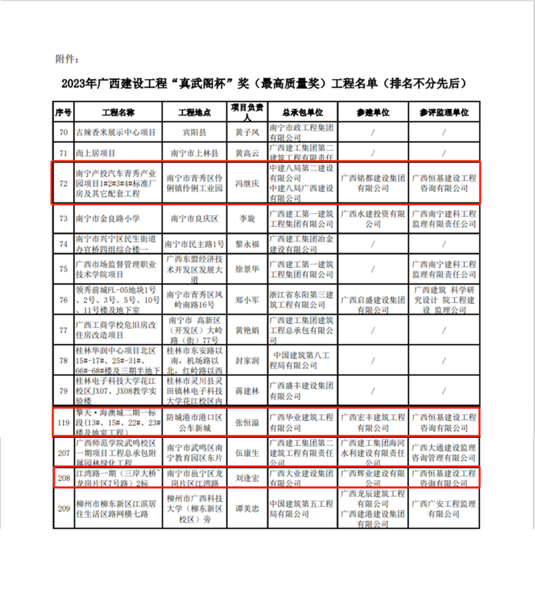 近日,廣西建筑業(yè)聯(lián)合會(huì)公布了2023年廣西建設(shè)工程“真武閣杯”獎(jiǎng)(最高質(zhì)量獎(jiǎng))工程評(píng)選結(jié)果。廣西恒基建設(shè)工程咨詢(xún)有限公司負(fù)責(zé)監(jiān)理的南寧市江灣路一期(三岸大橋~龍崗片區(qū)7號(hào)路)2標(biāo)工程項(xiàng)目、南寧產(chǎn)投汽車(chē)青秀產(chǎn)業(yè)園項(xiàng)目1#2#3#4#標(biāo)準(zhǔn)廠房及其它配套工程項(xiàng)目、防城港市擎天·海澳城二期一標(biāo)工程項(xiàng)目榮獲此獎(jiǎng)。
