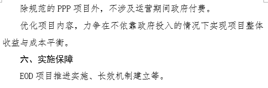 4、EOD項目中生態(tài)環(huán)境治理內(nèi)容需符合入庫范圍要求,且要有明確的生態(tài)環(huán)境改善目標(biāo)。產(chǎn)業(yè)開發(fā)要符合國家和地方產(chǎn)業(yè)政策、空間管控等各項要求,項目實施中嚴格落實招投標(biāo)、政府采購、投融資、土地、資源開發(fā)、政府債務(wù)風(fēng)險管控、資產(chǎn)處置等各項法規(guī)政策要求,依法依規(guī)推進項目規(guī)范實施,不以任何形式增加地方政府隱性債務(wù)。