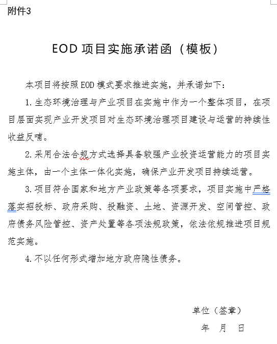 (四)EOD項目應(yīng)一并提交EOD項目實施方案(編制大綱見附件2)與承諾函(模板見附件3)。承諾函由項目申報主體和實施主體(市級及以下人民政府或園區(qū)管委會)蓋章。