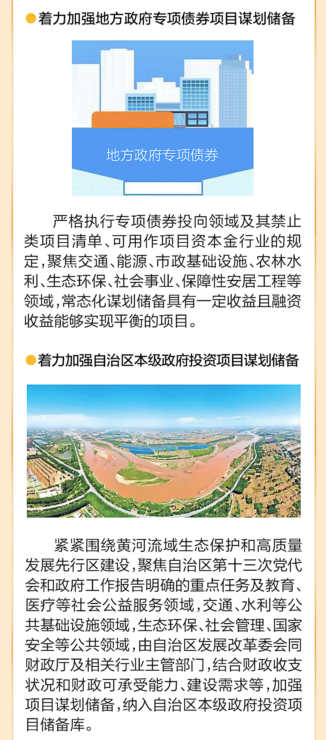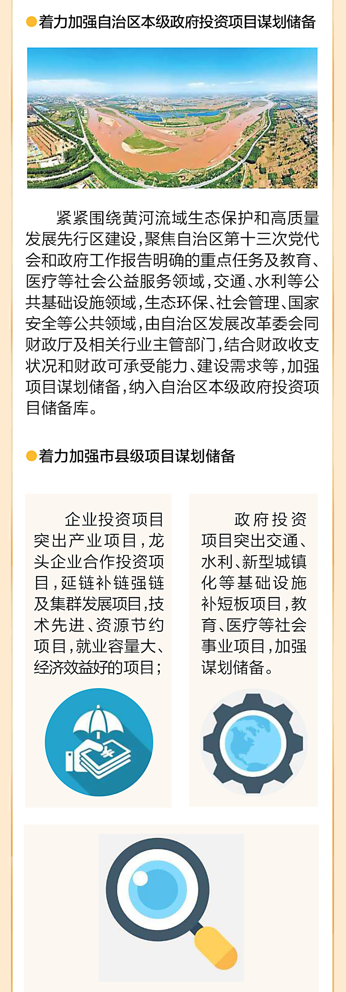 (三)著力加強(qiáng)自治區(qū)本級(jí)政府投資項(xiàng)目謀劃儲(chǔ)備。緊緊圍繞黃河流域生態(tài)保護(hù)和高質(zhì)量發(fā)展先行區(qū)建設(shè),聚焦自治區(qū)第十三次黨代會(huì)和政府工作報(bào)告明確的重點(diǎn)任務(wù)及教育、醫(yī)療等社會(huì)公益服務(wù)領(lǐng)域,交通、水利等公共基礎(chǔ)設(shè)施領(lǐng)域,生態(tài)環(huán)保、社會(huì)管理、國家安全等公共領(lǐng)域,由自治區(qū)發(fā)展改革委會(huì)同財(cái)政廳及相關(guān)行業(yè)主管部門,結(jié)合財(cái)政收支狀況和財(cái)政可承受能力、建設(shè)需求等,加強(qiáng)項(xiàng)目謀劃儲(chǔ)備,納入自治區(qū)本級(jí)政府投資項(xiàng)目?jī)?chǔ)備庫。對(duì)納入儲(chǔ)備庫的項(xiàng)目按照“突出重點(diǎn)、先急后緩、有保有壓”原則,由自治區(qū)發(fā)展改革委列入年度自治區(qū)預(yù)算內(nèi)統(tǒng)籌投資建議計(jì)劃,建議計(jì)劃報(bào)自治區(qū)人民政府分管發(fā)展改革部門的領(lǐng)導(dǎo)審核后,提請(qǐng)自治區(qū)人民政府常務(wù)會(huì)議審定。