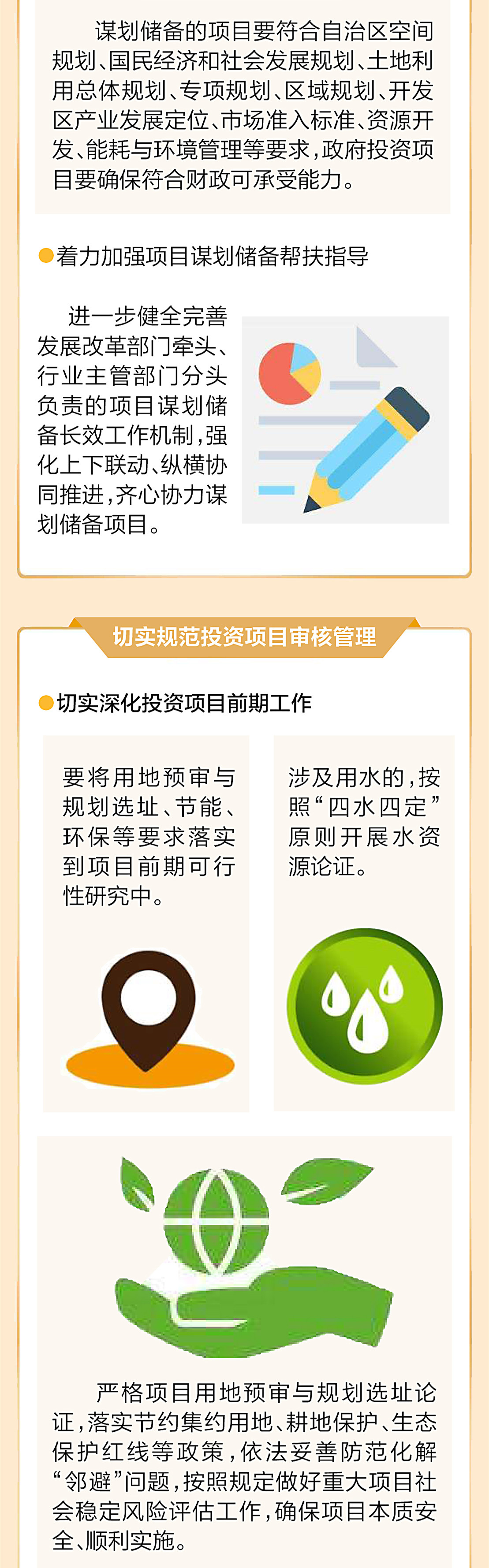 (四)著力加強(qiáng)市縣級(jí)項(xiàng)目謀劃儲(chǔ)備。根據(jù)國家和自治區(qū)國民經(jīng)濟(jì)和社會(huì)發(fā)展規(guī)劃綱要明確的重大工程項(xiàng)目和各專項(xiàng)規(guī)劃等,緊盯國家重大戰(zhàn)略和投資導(dǎo)向,按照有利于補(bǔ)齊短板、增加供給、滿足需求、優(yōu)化結(jié)構(gòu)、改善民生、保護(hù)生態(tài)的原則,企業(yè)投資項(xiàng)目突出產(chǎn)業(yè)項(xiàng)目,龍頭企業(yè)合作投資項(xiàng)目,延鏈補(bǔ)鏈強(qiáng)鏈及集群發(fā)展項(xiàng)目,技術(shù)先進(jìn)、資源節(jié)約項(xiàng)目,就業(yè)容量大、經(jīng)濟(jì)效益好的項(xiàng)目;政府投資項(xiàng)目突出交通、水利、新型城鎮(zhèn)化等基礎(chǔ)設(shè)施補(bǔ)短板項(xiàng)目,教育、醫(yī)療等社會(huì)事業(yè)項(xiàng)目,加強(qiáng)謀劃儲(chǔ)備。謀劃儲(chǔ)備的項(xiàng)目要符合自治區(qū)空間規(guī)劃、國民經(jīng)濟(jì)和社會(huì)發(fā)展規(guī)劃、土地利用總體規(guī)劃、專項(xiàng)規(guī)劃、區(qū)域規(guī)劃、開發(fā)區(qū)產(chǎn)業(yè)發(fā)展定位、市場(chǎng)準(zhǔn)入標(biāo)準(zhǔn)、資源開發(fā)、能耗與環(huán)境管理等要求,政府投資項(xiàng)目要確保符合財(cái)政可承受能力。