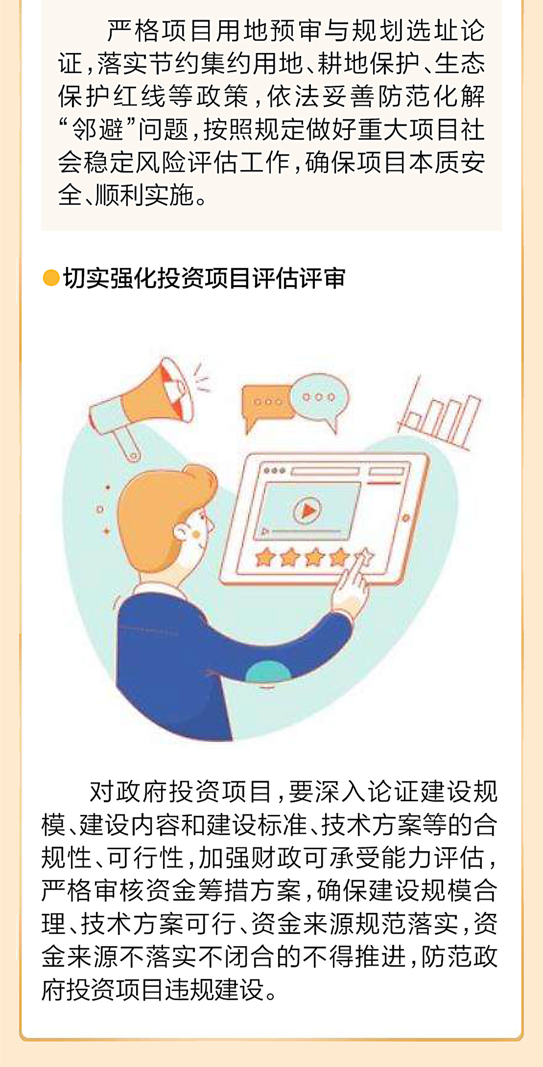(二)切實(shí)強(qiáng)化投資項(xiàng)目評(píng)估評(píng)審。對(duì)政府投資項(xiàng)目,要深入論證建設(shè)規(guī)模、建設(shè)內(nèi)容和建設(shè)標(biāo)準(zhǔn)、技術(shù)方案等的合規(guī)性、可行性,加強(qiáng)財(cái)政可承受能力評(píng)估,嚴(yán)格審核資金籌措方案,確保建設(shè)規(guī)模合理、技術(shù)方案可行、資金來源規(guī)范落實(shí),資金來源不落實(shí)不閉合的不得推進(jìn),防范政府投資項(xiàng)目違規(guī)建設(shè)。涉及舉債融資的項(xiàng)目,要將融資方案作為可行性研究論證重點(diǎn),堅(jiān)決防止新增政府隱性債務(wù)。對(duì)企業(yè)投資項(xiàng)目,要重點(diǎn)審查是否符合發(fā)展規(guī)劃、產(chǎn)業(yè)政策、準(zhǔn)入標(biāo)準(zhǔn)、用地政策、環(huán)保政策、用能政策等,確保項(xiàng)目依法合規(guī)實(shí)施。對(duì)高耗能、高排放項(xiàng)目,要深入論證建設(shè)的必要性、可行性,堅(jiān)決遏制“兩高”項(xiàng)目盲目發(fā)展、違規(guī)上馬。