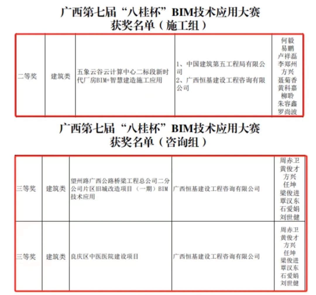 近日,廣西壯族自治區(qū)第七屆“八桂杯” BIM技術(shù)應(yīng)用大賽獲獎(jiǎng)名單公布,恒基咨詢參賽項(xiàng)目《五象云谷云計(jì)算中心二標(biāo)段新時(shí)代廠房BIM+智慧建造施工應(yīng)用》榮獲施工組二等獎(jiǎng),《望州路廣西公路橋梁工程總公司二分公司片區(qū)舊城改造項(xiàng)目(一期)BIM技術(shù)應(yīng)用》《良慶區(qū)中醫(yī)醫(yī)院建設(shè)項(xiàng)目》榮獲咨詢組三等獎(jiǎng)。