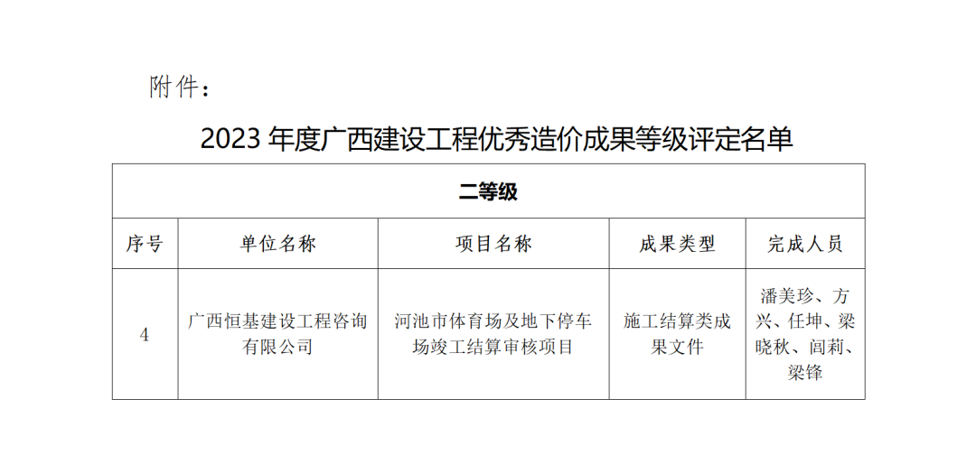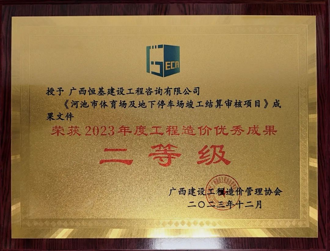近日,廣西建設工程造價管理協(xié)會召開第五屆第五次理事會暨第三次會員代表大會,會上頒發(fā)2023年度優(yōu)秀工程造價成果等級評定證書,恒基咨詢《河池市體育場及地下停車場竣工結(jié)算審核項目》成果文件榮獲2023年度工程造價優(yōu)秀成果二等級。