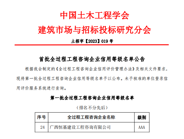 近日,中國(guó)土木工程學(xué)會(huì)建筑市場(chǎng)與招標(biāo)投標(biāo)研究分會(huì)公布了第一批全過(guò)程工程咨詢企業(yè)信用等級(jí)名單,恒基咨詢位列其中,獲評(píng)最高等級(jí)AAA級(jí)信用評(píng)級(jí)。
