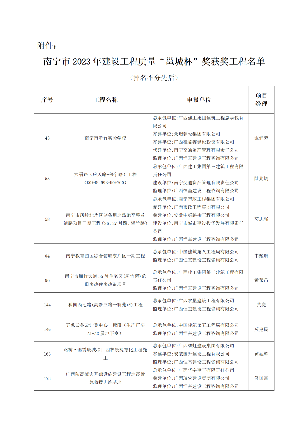 近日,南寧市建筑業(yè)聯(lián)合會(huì)公布了南寧市2023年建設(shè)工程質(zhì)量“邕城杯”獎(jiǎng)獲獎(jiǎng)工程名單。經(jīng)初審、實(shí)地核查、獎(jiǎng)前公示、審定等4個(gè)階段,恒基咨詢監(jiān)理的“南寧市翠竹實(shí)驗(yàn)學(xué)?!钡?個(gè)項(xiàng)目,成功斬獲該獎(jiǎng)項(xiàng),充分展現(xiàn)了公司的服務(wù)質(zhì)量和綜合實(shí)力。