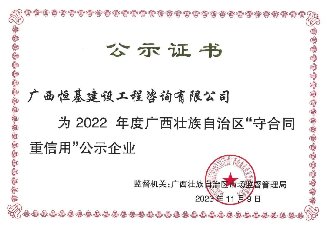 近日,廣西壯族自治區(qū)市場監(jiān)督管理局公布了《關于公示2022年度廣西“守合同重信用”企業(yè)名單的通告》。恒基咨詢榜上有名,憑借良好信譽再獲廣西“守合同重信用”企業(yè)榮譽稱號。