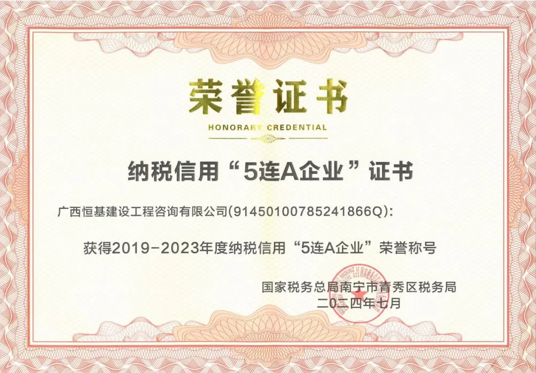 近日,恒基咨詢榮獲國家稅務(wù)總局南寧市青秀區(qū)稅務(wù)局頒發(fā)的《納稅信用“5連A企業(yè)”證書》,成功摘得2019-2023年度納稅信用“5連A企業(yè)”殊榮。