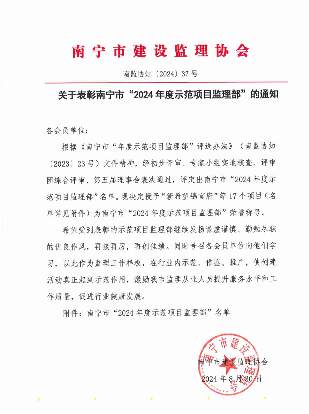8月30日,南寧市建設監(jiān)理協(xié)會公布了“2024年度示范項目監(jiān)理部”評選結果,恒基咨詢監(jiān)理的南寧市友愛南路13號小區(qū)危舊房改住房改造項目脫穎而出,成功入選。