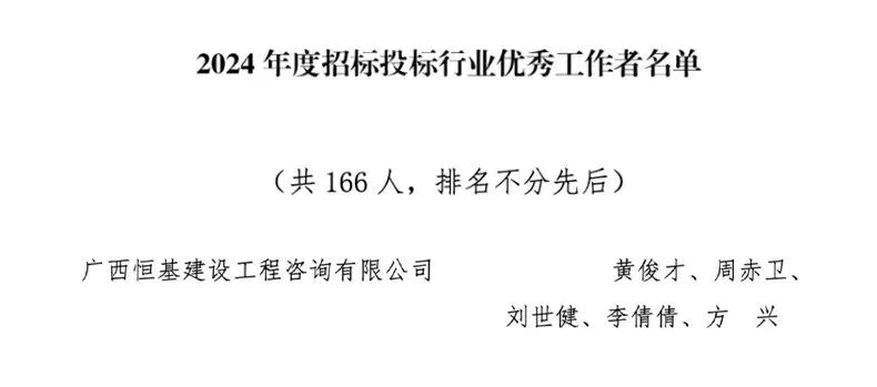 2025年9月22日,廣西建筑業(yè)聯(lián)合會公布了2024年度招標(biāo)投標(biāo)行業(yè)優(yōu)秀企業(yè)和優(yōu)秀工作者名單,廣西恒基建設(shè)工程咨詢有限公司憑借卓越的專業(yè)能力和優(yōu)質(zhì)的服務(wù),成功榮獲2024年度招標(biāo)投標(biāo)行業(yè)優(yōu)秀企業(yè)稱號,多名員工同時榮獲招標(biāo)投標(biāo)行業(yè)優(yōu)秀工作者稱號。