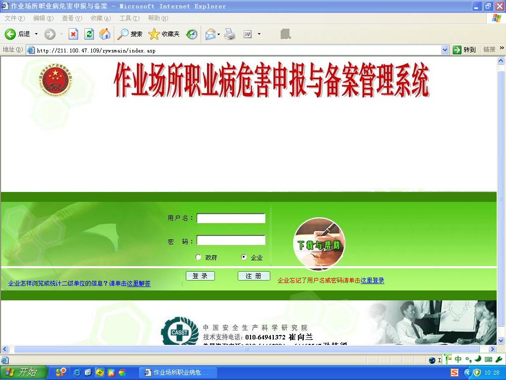 1、進(jìn)入“作業(yè)場(chǎng)所職業(yè)病危害申報(bào)與備案管理系統(tǒng)”(網(wǎng)址:http://211.100.47.109/zywsmain/);